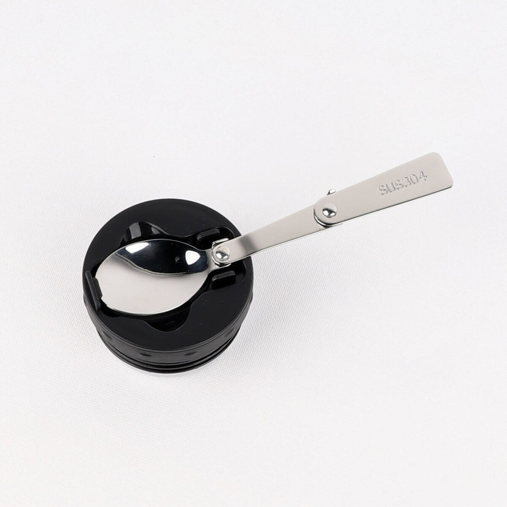 Termosun içindeki 200ml kap ve katlanır kaşık, taşıması ve kullanması kolay bir deneyim sunar.
